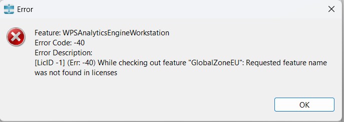 Error Description: [LicID -1] (Err: -40) While checking out feature “GlobalZoneEU”: Requested feature name was not found in licenses.